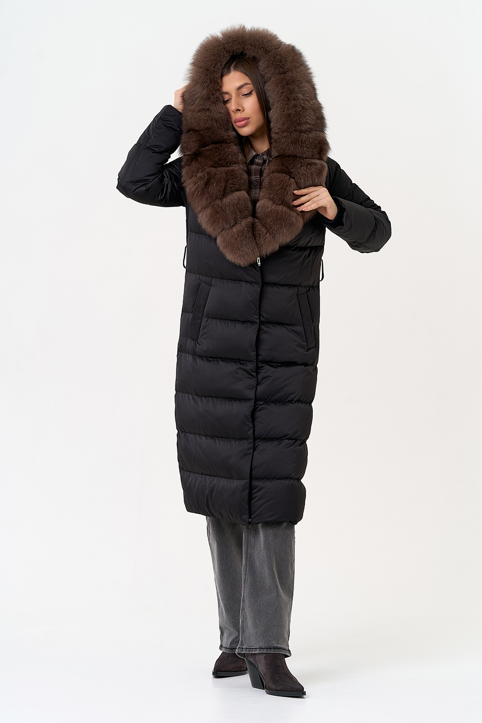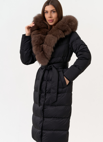 Крой воротника - капюшон, отделка мех песца